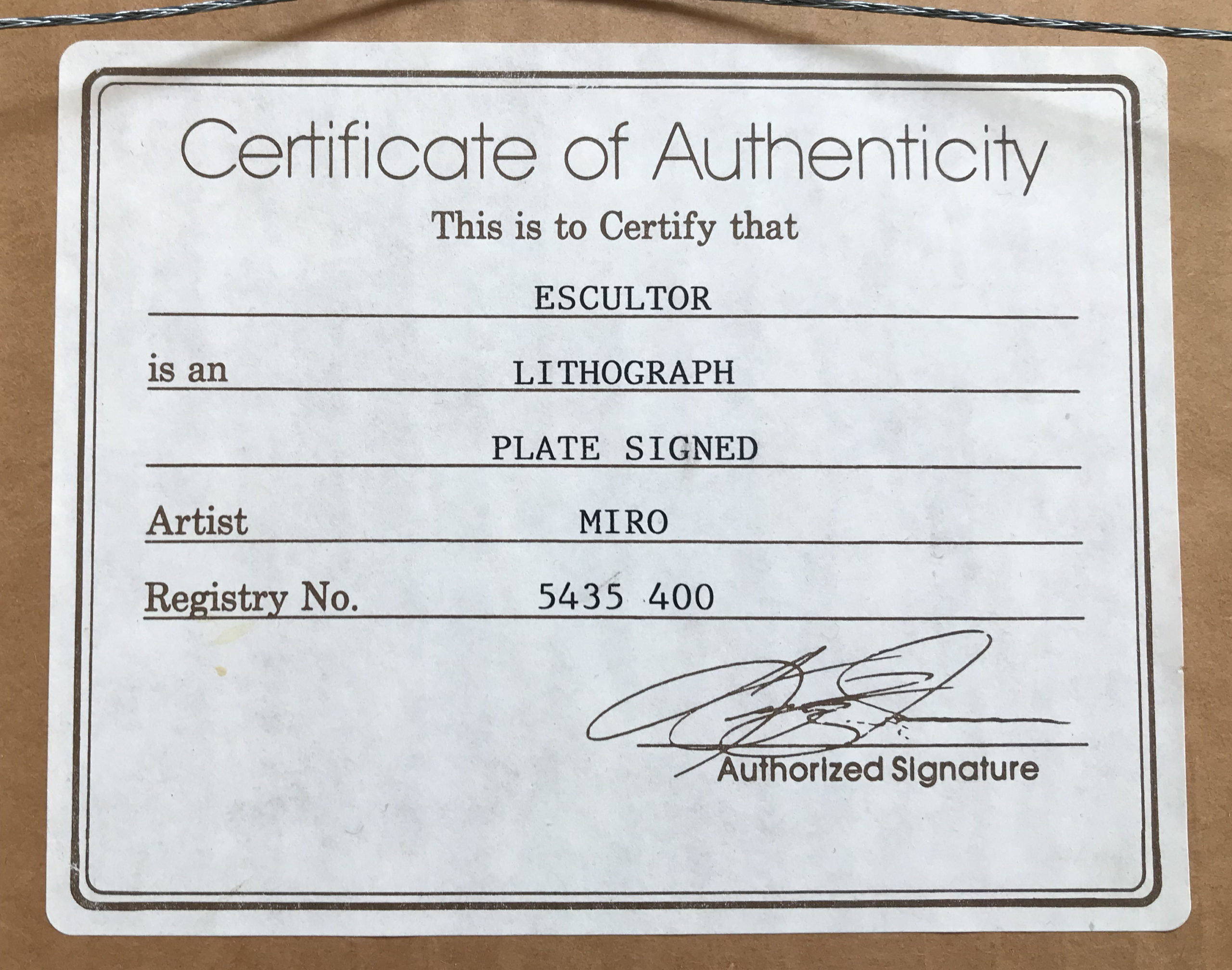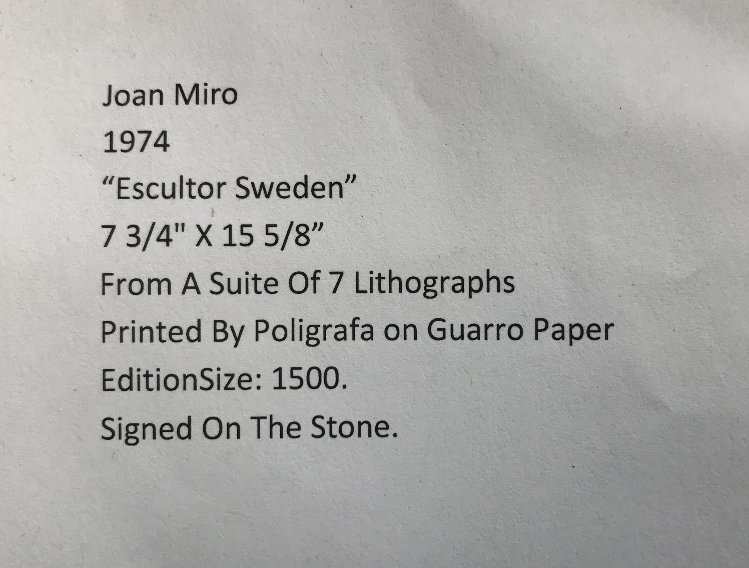 May 27, 2021 Paula Pietranera ARTIST: Joan Miró TITLE: Esculptor Sweden YEAR: 1974 SIZE: 7 3/4″ x 15 5/8″ MEDIUM / MATERIAL: Lithograph. Signed on the stone. Framed ACQUISITION: — APPRAISAL DATE & VALUE: — LOCATION: CC300 – Central Abbot’s quarters Categories: Framed, Printwork Tag: City Center 300 Page St.