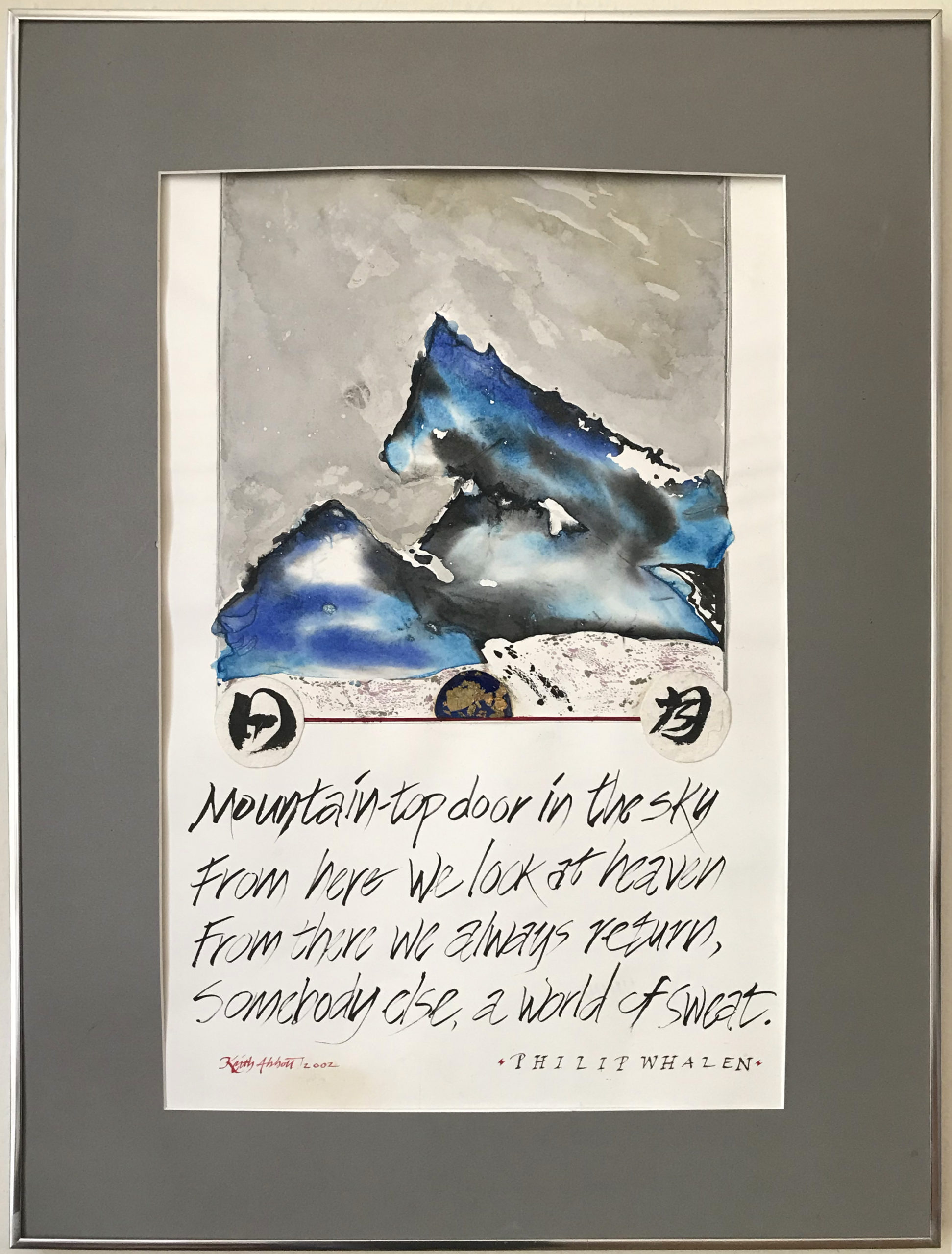MEDIUM / MATERIAL: Mixed media (sumi ink, watercolor, gouache, acrylic and gold leaf). Framed. Glass missing.